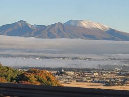 長野県某所の今朝の風景。身内が送ってきましたが、山には雪が積もっています。